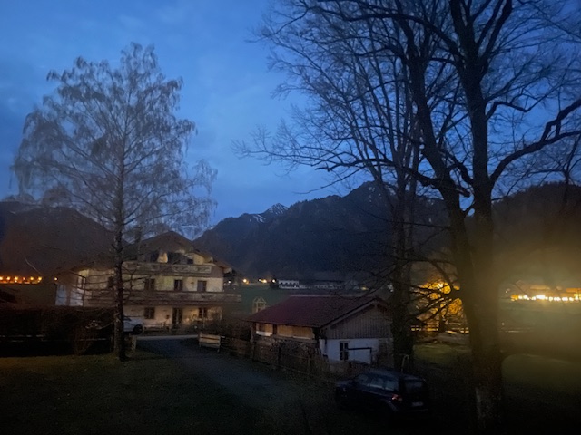 Um genau zu sein, um 5:42 Uhr. Da pfeift der erste Vogel vor dem Fenster und der Stall vom Nachbarn – ganz rechts außen im Bild – ist bereits hell erleuchtet, die Kühe wollen gemolken werden. Ich kann zum Glück wieder ins warme Bett hüpfen.