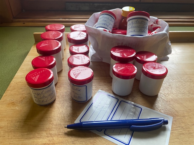 Bis der Kaffee, der für die Große, durchgelaufen ist, beschrifte ich die Salbendöschen, die ich gestern gefüllt habe mit Dreierlei: Weidenrinden-Salbe, Fichtenharz-Salbe und Engelwurz-Salbe, falls es jemand interessiert.