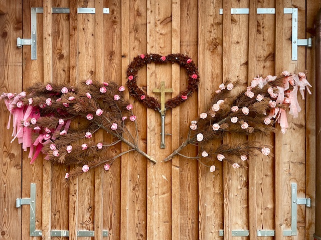Auf dem Heimweg gibt es dann noch was Herziges: der Blumenschmuck vom vergangenen Almabtrieb hängt beim Bauern an der Stallwand – ja, genau der, der heute morgen um 5:42 Uhr das Licht anhatte.