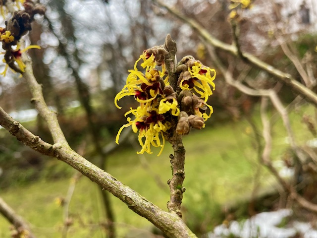 Pünktlich zum ersten 12von12 des Jahres blüht – wie jedes Jahr in meinem Garten – die Zaubernuss. Ich liebe diese strubbeligen Blütenköpfchen.