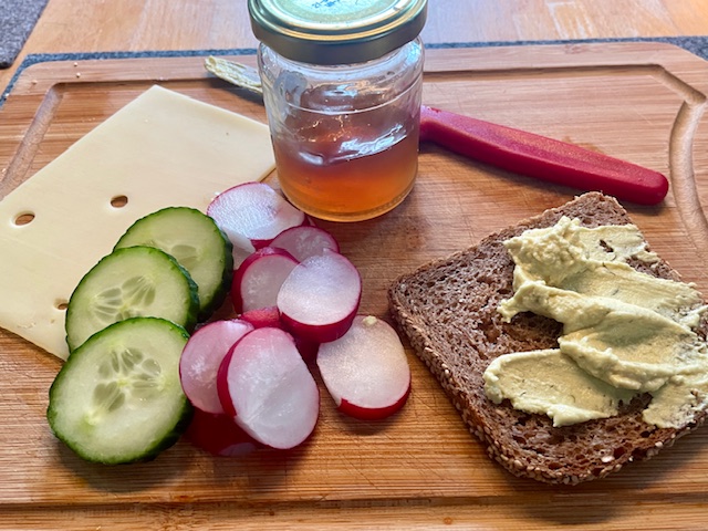 Wieder zuhause angekommen, gibt es dann ein Frühstück. Schön bunt bitte, damit das Immunsystem ordentlich gepflegt wird, es gilt ja gerade viele Keime abzuwehren, die da überall herum fliegen.