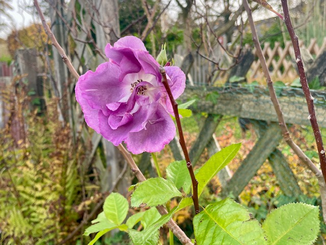 Auf dem Weg zurück grüßt dann diese edle, violette „Last Rose of Summer“ vom Zaun her, Dankeschön.