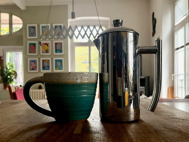 Zum 8-Uhr-Läuten gab es dann für Frau Dannheim den ersten Kaffee. Und wie fast jeden Morgen habe ich – wahrscheinlich in meiner Gier – die Kanne wieder zu weit aufgefüllt, so dass beim Niederdrücken ein kleiner Schwall Kaffee-Pulver-Brühe über den Küchentisch schoss. Ich kenn das schon, kenne mich ja, bin geduldig mit mir und freue mich auf und über den ersten Kaffee.