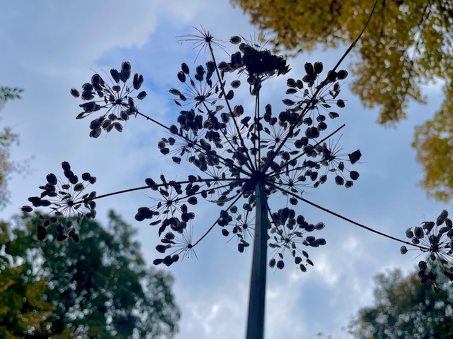 Aber es ist ja nicht nur alles knallig bunt im Herbst. Hier zeigt der ausgeblühte und versamte Bärenklau stolz himmelwärts seine eingetrocknete Struktur. Wirklich ein bärenstarkes Gewächs. Und bildschön!