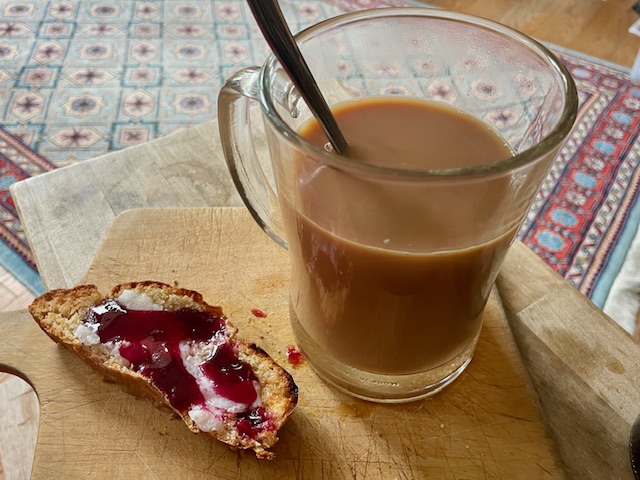Dringend Zeit für eine kleine Teepause mit letztem Stückchen Hefezopf und Traubengelee von der diesjährigen Traubenernte am Balkongeländer, vorzüglich – nicht das Balkongeländer, sondern das Traubengelee.