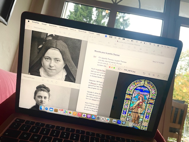 Danach wird es mir kreativ zumute und ich poliere an der „Musette pour la petite Thérèse“, die ich derzeit für die Eröffnung der Kulturräume am 26.10. in der ehemaligen St. Theresienkirche am Stadtwald schreibe. Ich liebe es sehr, so in die Leben anderer Menschen eintauchen zu dürfen. Und wenn dann noch Musik im Spiel ist, ist sowieso alles gut – dazu später.