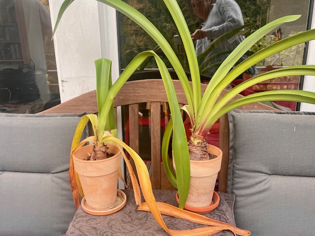 Blick vom Sofa lenkt nach draußen auf den Balkon – quasi rückwärtig zum Ranke-Wein – hier gedeiht gerade meine aktuelles „Amaryllis-ihr-sollt-übersommern-Projekt“. Wobei ich mir nicht so sicher bin, wie es wirklich gedeihen wird. Die Blätter sollten eigentlich schon längst eingetrocknet sein, damit dann, nach Rückschnitt, die Dunkel-Phase folgen sollte. Auf dass die Zwiebeln – die ums letzte Weihnachten üppigst bis in den März hinein geblüht hatten, dann zum Dezember wieder austreiben. Die rechte hier hat aber überhaupt keine Lust, einzutrocknen. Kann ich gut verstehen.