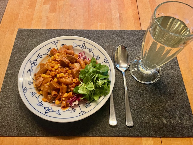 Zum frühen Abend gibt es eine flinke Brutzel-Pfanne mit Vevapcici – also veganes Lupin-Cevapcici. Mit Nudeln, Zwiebeln und Mais – sehr lecker. Und was Herr Merz dazu sagt, ist mir sowas von Wurst.