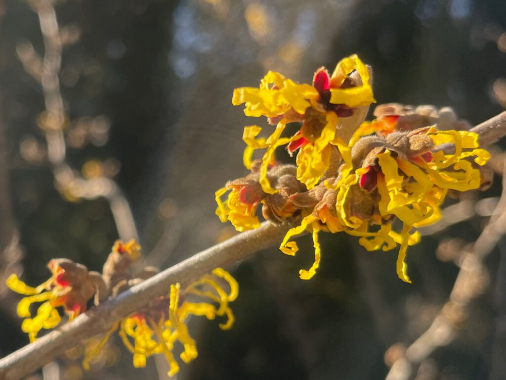 Ich sitze in diesem Januar sehr viel und lange an meinem Schreibtisch und plane, resümiere die vergangenen Arbeitserfolge und analysiere die Stellen, an denen ich optimieren möchte – da gibt es ein paar. Wie gut tut es da, zwischendurch rauszuschauen – rauszugehen, denn im garten vor meinem Fenster blüht – Dada: die Zaubernuss: